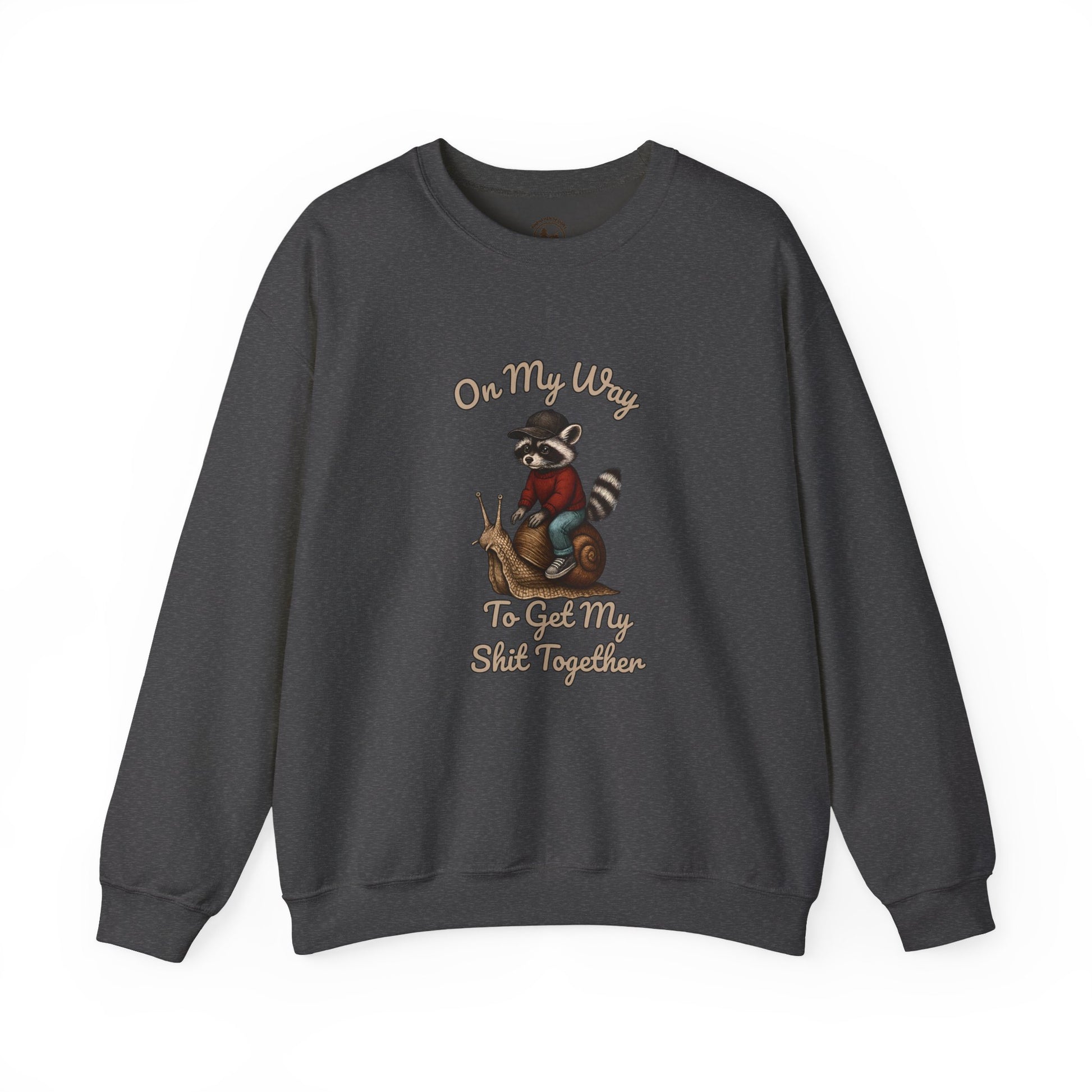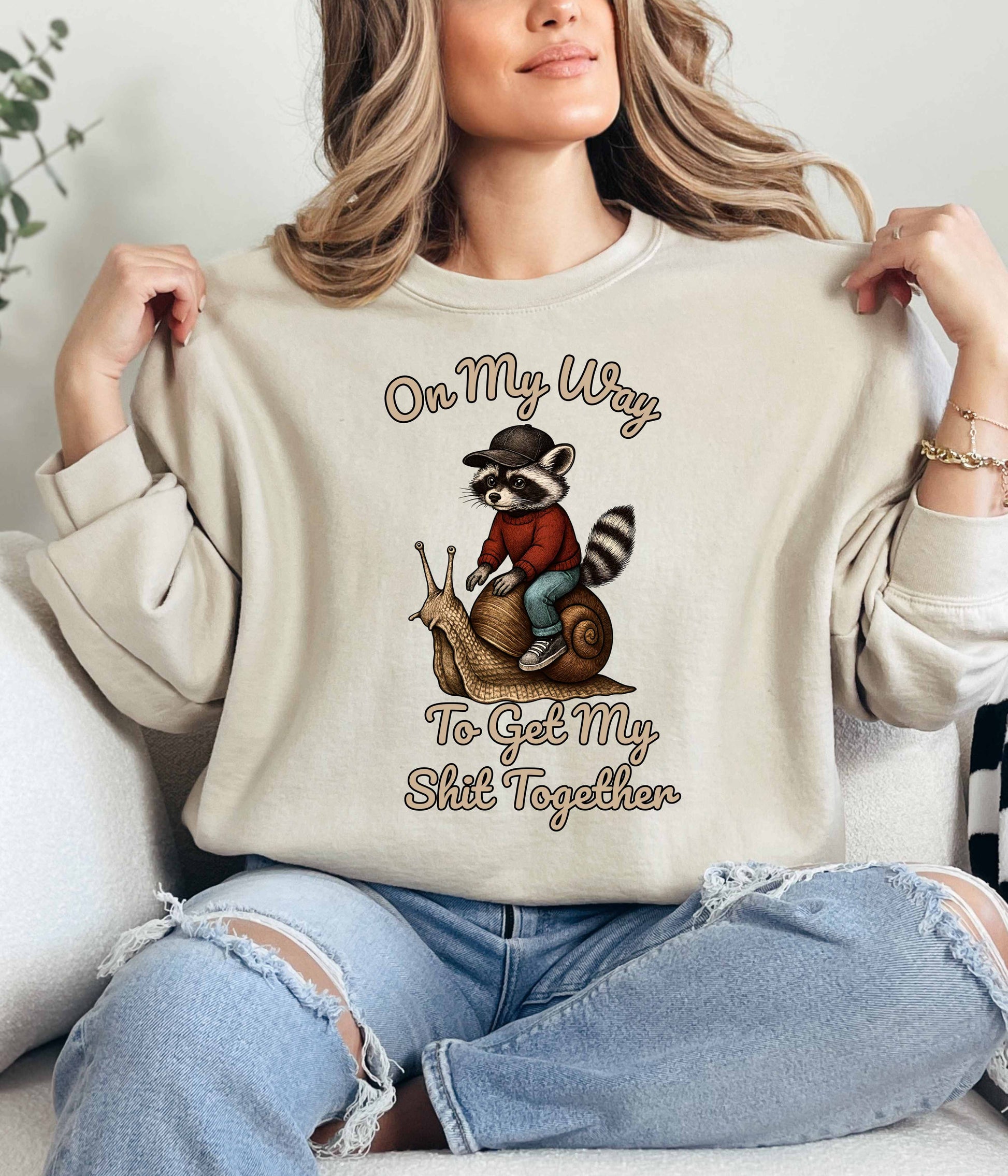 funny raccoon sweatshirt, sarcastic crewneck, Gildan 18000 sweatshirt, snail and raccoon sweater, relatable humor sweatshirt, unisex graphic crewneck, “get my sh*t together” sweater